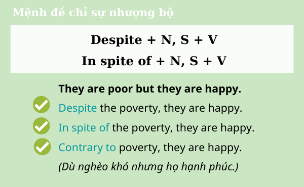 "Despite" và "in spite of" là những từ chỉ sự trái ngược, được sử dụng để giải thích một điều không mong đợi xảy ra. Cả hai từ này có nghĩa tương tự nhau và thường được sử dụng trong câu với một danh từ hoặc một cụm danh từ. Ví dụ: Despite the rain, I went for a walk. (Mặc dù trời đang mưa, tôi đi dạo.)