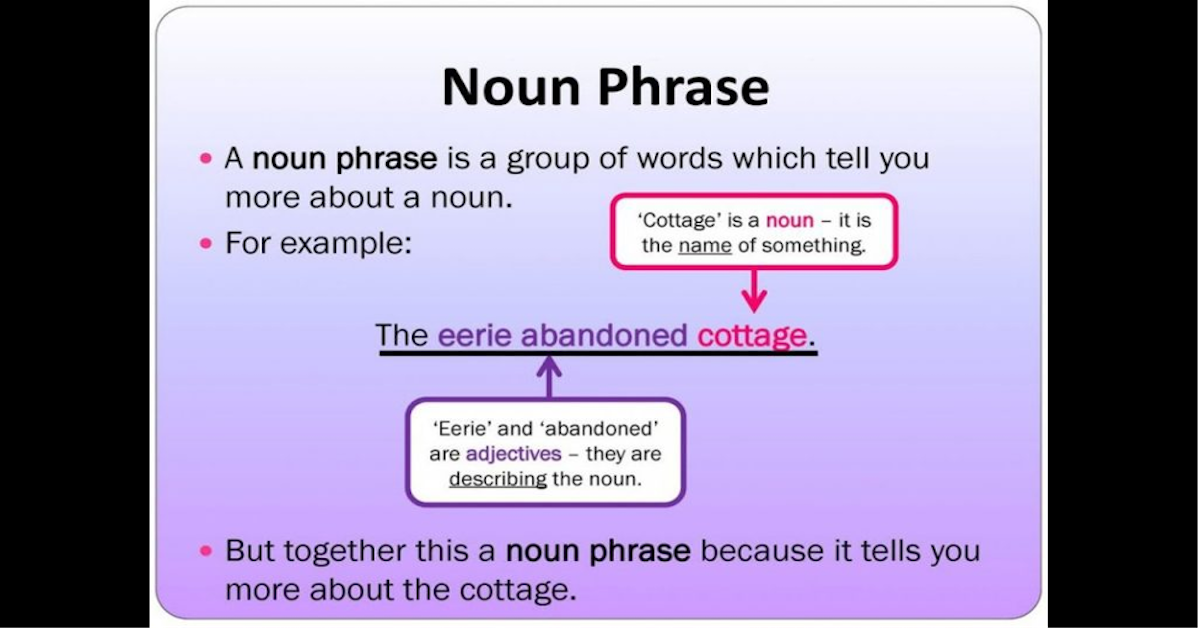 Một cụm danh từ bao gồm một danh từ chính (head noun) và có thể được bổ sung bởi các từ định danh (determiners), tính từ (adjectives), các mệnh đề quan hệ (relative clauses) hoặc các giới từ (prepositions).